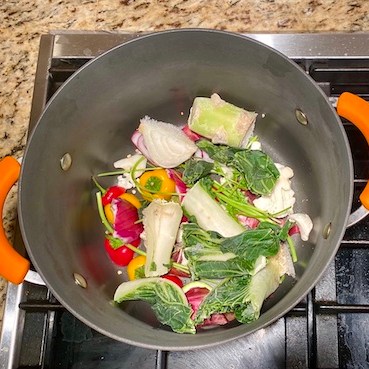 - Scraps can be garlic peels, onion peels, cilantro stems, bell pepper stems, etc. I save any part of every vegetable and collect them into a container over the course of a week if I plan to make broth or freeze them in a bag or container for later use in a broth