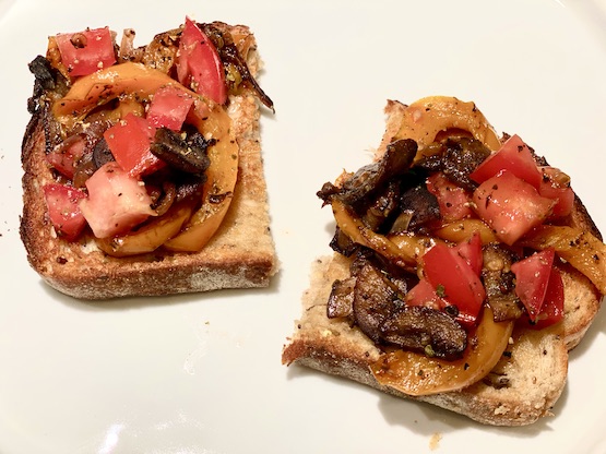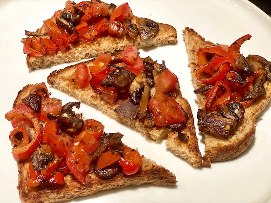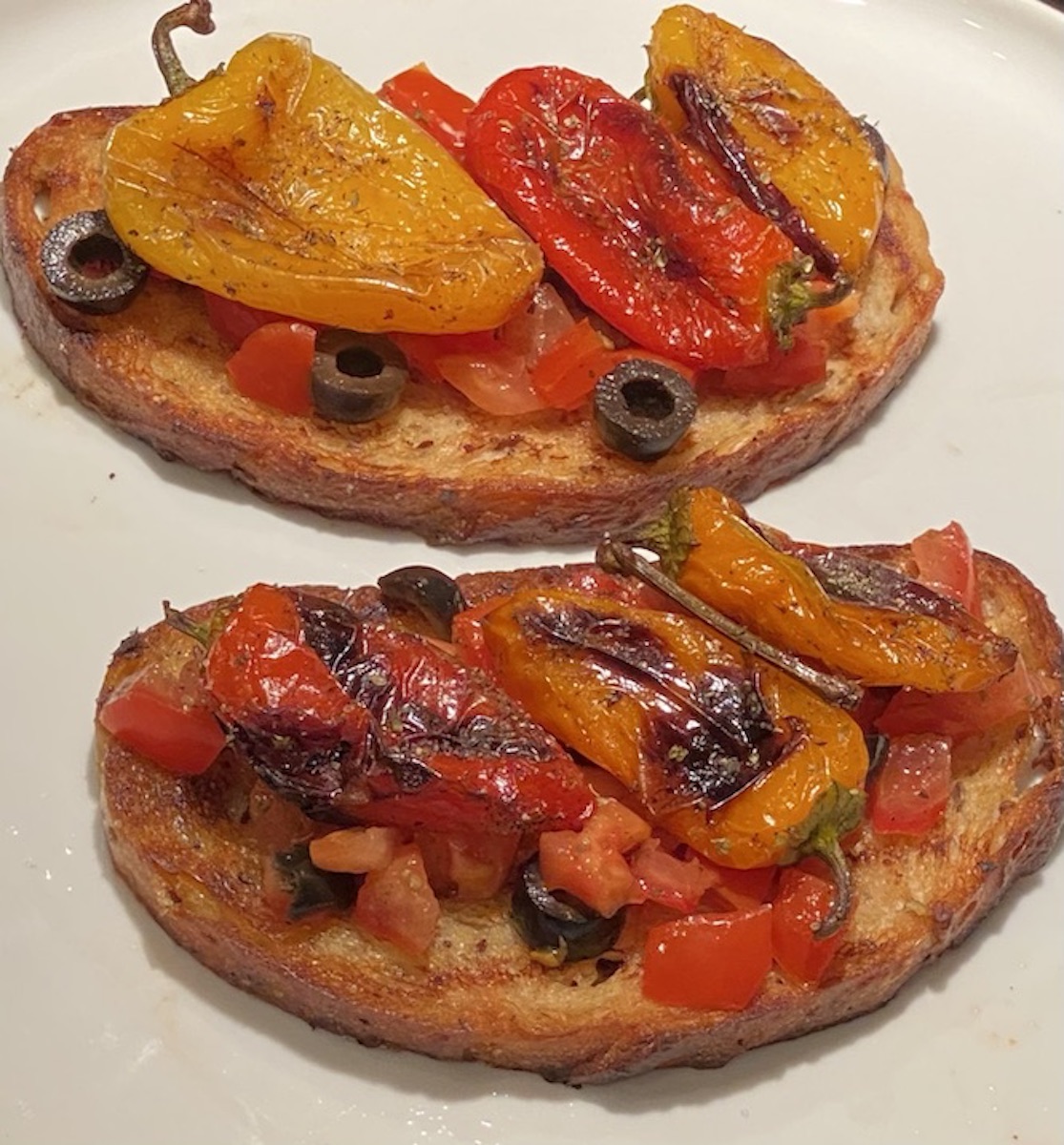 Olive tamponade can be added to the bread prior to topping with tomatoes or sweet peppers or sautéed veggies.