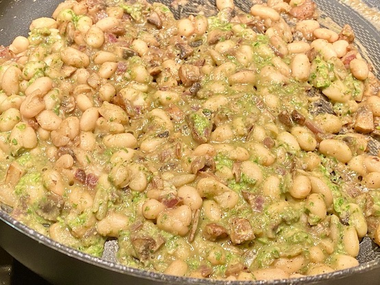 - Add 1 can (or ~2 cups) white beans. Mix. Cook 2 minutes. Add 1/4 c water and allow it to simmer so the mixture thickens. Smash some of the beans (about a quarter of the mixture) during this step to thicken further.