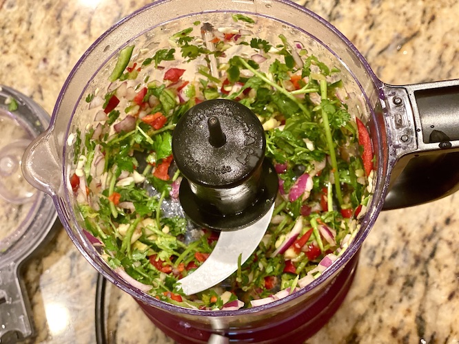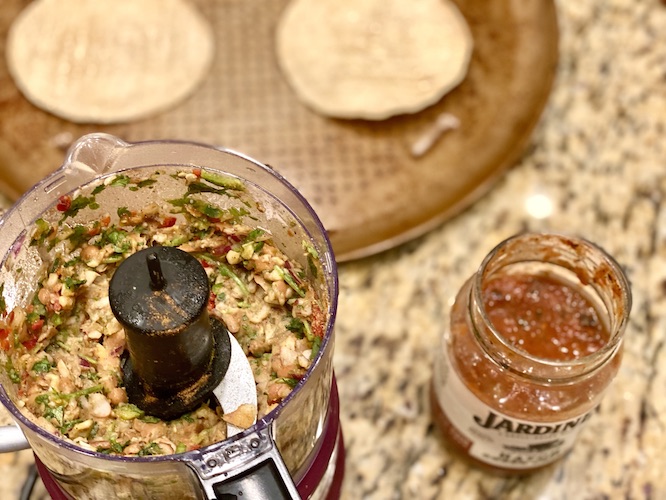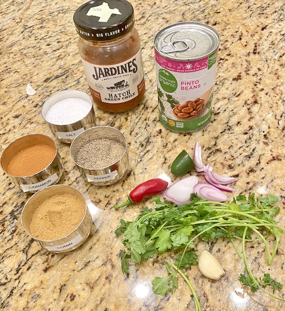 - Place next five ingredients into a food processor and chop: 2c (or 1 can) pinto beans, 1 jalapeño (adjust to desired heat), 1/4 onion, 1 clove garlic, handful cilantro (about 1/8 of a bunch)