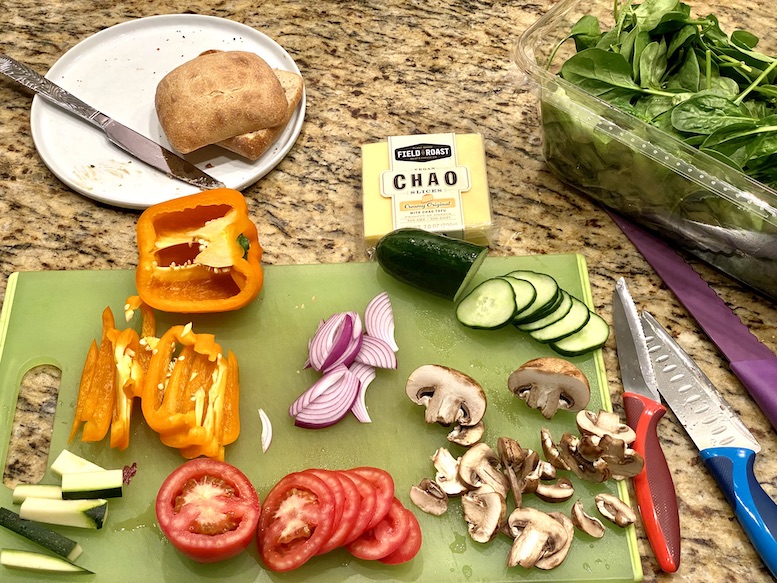 - Vegan cheese – cheeze (vegan cheese) does not really add nutrition but I like this flavor of this one and the provolone cheezes I have found. A good substitute would be a slice of grilled tofu which would would add plenty of nutrition and creaminess.