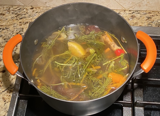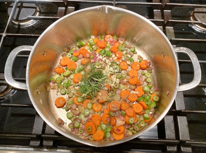 - Add three chopped carrots, chopped fennel stalk, 1/2 chopped onion. Cook until slightly softened and onions translucent.