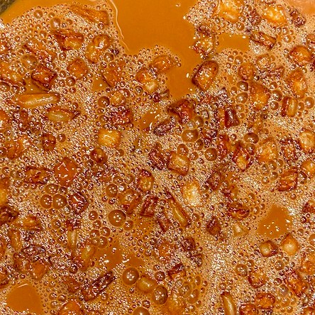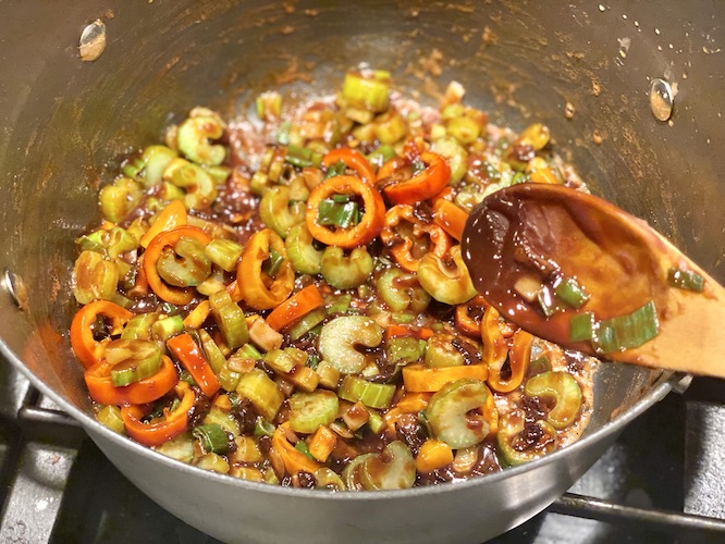 Stir continuously for 45 minutes. The color of the roux will evolve from raw pancake batter color to golden pancake color to a golden caramel color then a darker caramel color and finally to a deep brown molasses color. Once it is a dark caramel color, turn down to low heat and add chopped yellow onion and stir with a wooden spoon. Stir continuously until it is the dark brown color. The roux with onions will smell amazing at this point. - Add rest of chopped vegetables (celery, peppers, green onion, okra, parsley) to the roux and mix together for about 30 seconds.