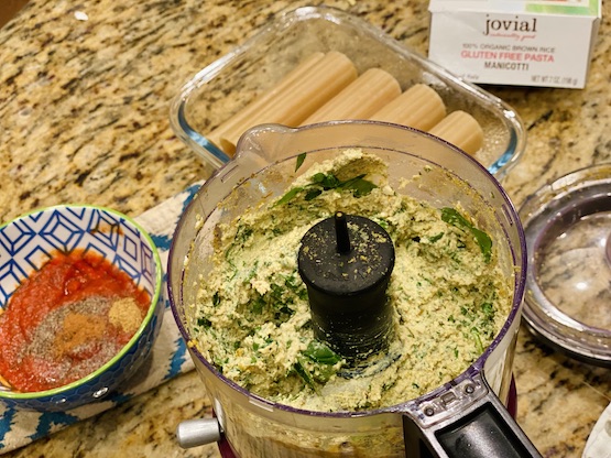 - For Filling (Tofu Ricotta): Break apart one 15-oz block of tofu and place into a food processor. Add 1/3 c nutritional yeast, 2 Tbsp oregano, 1/4 tsp salt, 1 tsp lemon juice. Puree together. Mix in 2 c chopped spinach. You can also mix in other finely chopped vegetables, but I like my manicotti pretty plain – besides, the tofu and spinach add plenty of protein.
