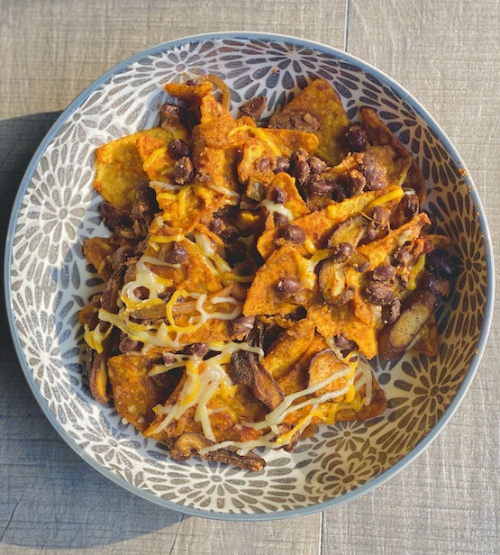 - Transfer to a dish, top with mushrooms and sprinkle with vegan cheese and chopped cilantro. — Can be transferred to an oven safe dish to reheat in the oven at 350F for about 8 minutes (make sure to sprinkle with some water to avoid drying out the dish)