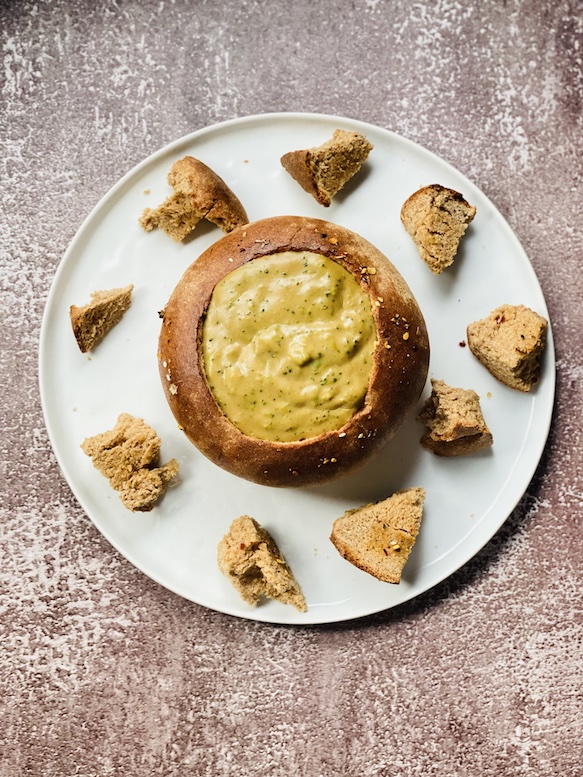 I made a bowl out of one loaf and ate broccoli “cheddar” soup (i.e. vegan broccoli potato soup) out of it and it was just like the broccoli cheddar soup bowls I used to get at Panera. Just like then, I of course could not eat an entire loaf of bread. I scooped out the inner soup-soaked surfaces of the bread and ate it and then sliced the rest of the bread into chunks to dip in to my leftover soup (or you can try to reuse the bread bowl for the leftover soup