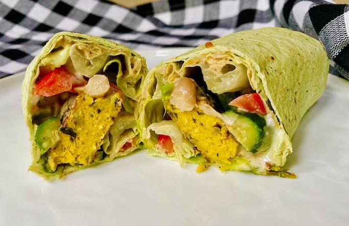 - Heat falafel burger. Cut into 4-6 slices or cubes