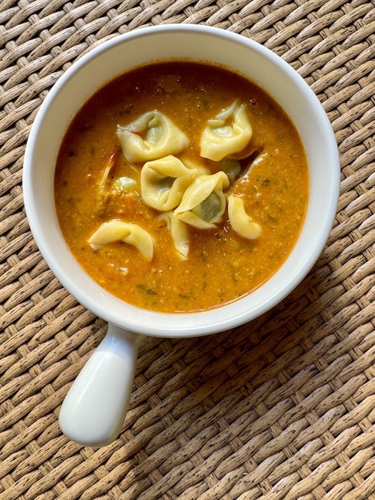 - Allow to cool about 10 minutes and then serve! I added some vegan tortellini into mine (to avoid eating a loaf of bread with it..)