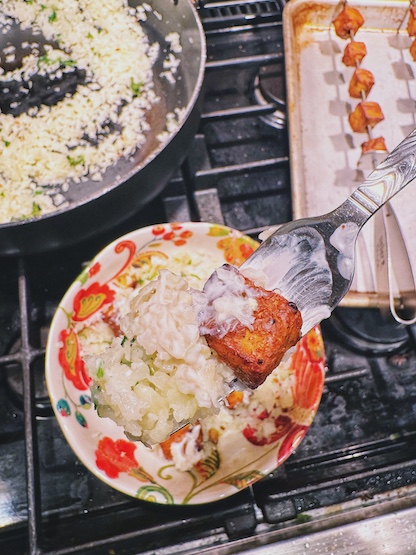- Place the tofu pieces on the skewers and balance the skewers on a baking sheet