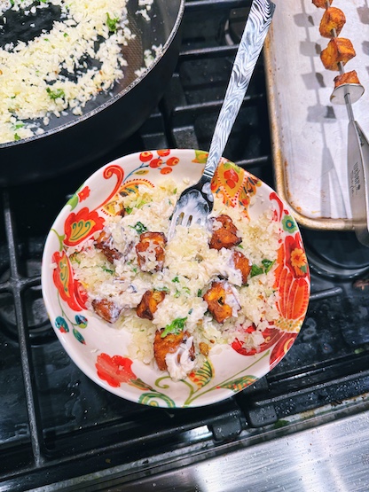 - I ate this on a bed of cauliflower rice which I cooked with cumin seeds and then fresh coriander. I added some extra Greek yogurt when serving. Next, I plan to make this in a pita wrap with fresh tzatziki sauce, sliced onions, and chopped tomatoes.