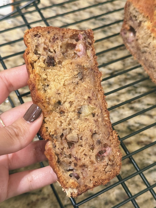 - I don’t find it necessary to add chocolate chips as it makes it too sweet for my liking. You could just top with mini chocolate chips for a hint of chocolate. This will cook for over 40 mins which can make chocolate chips melt thoroughly into the batter which I do not enjoy but others may. It tastes way better on its own and you can enjoy the banana and walnut tastes and textures more that way.