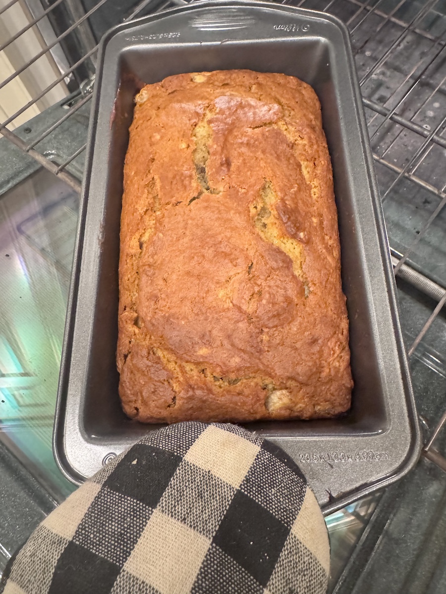 - Pour into greased bread pan or scoop into muffin tins